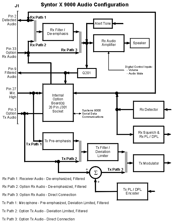 Syntor X 9000: A better explanation of the trunking control head programming problem was added to the Syntor X 9000E to Syntor X 9000 conversion section. An error in the Detected Audio path direction was corrected in the audio routing diagram drawing. Another control head trouble shooting symptom was added.